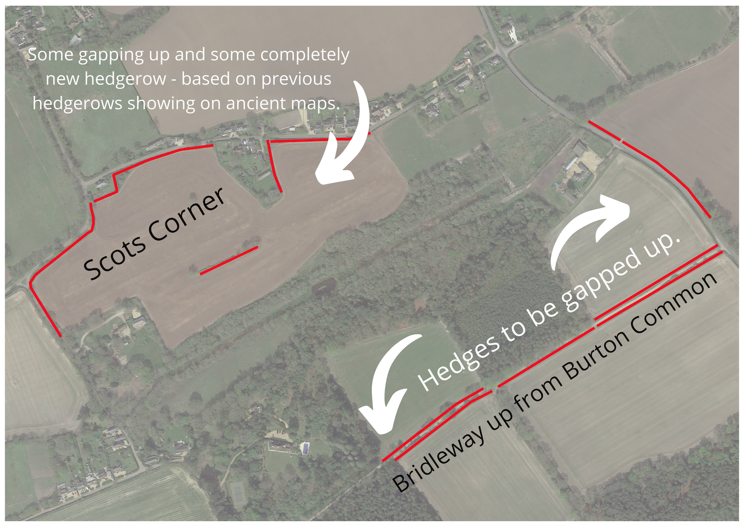 The Scot’s Corner site. Currently an expansive field with poor quality soil being eroded through exposure to the elements. New hedging will split this field again based on old plans of hedgerows from the past.